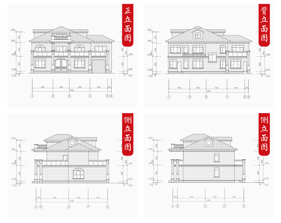 建筑圖: | 建筑平面圖:一層平面圖,二層平面圖; 建筑立面圖:東立面圖,西立面圖,南立面圖,北立面圖,剖面圖; 大樣圖:樓梯詳圖,細部大樣,門窗大樣 |