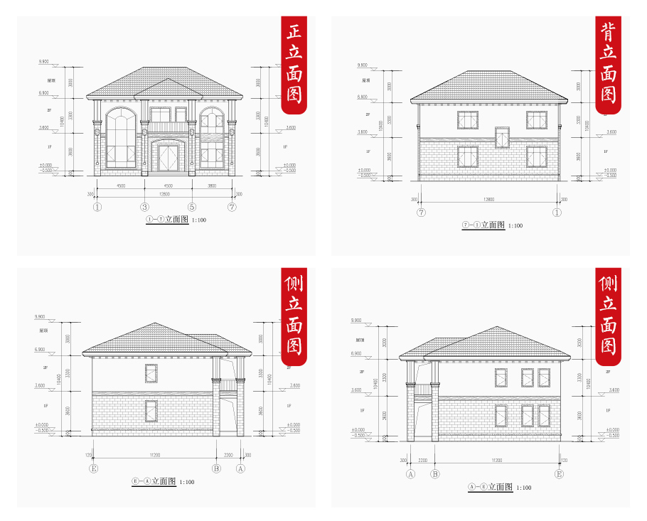 建筑立面圖:東立面圖,西立面圖,南立面圖,北立面圖,剖面圖;