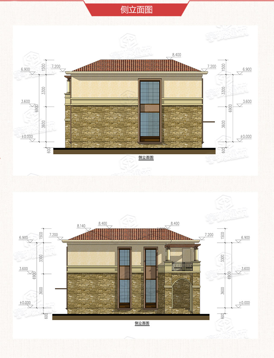 成品圖紙>帶露臺的西班牙風(fēng)格二層小農(nóng)村別墅戶型及效果圖