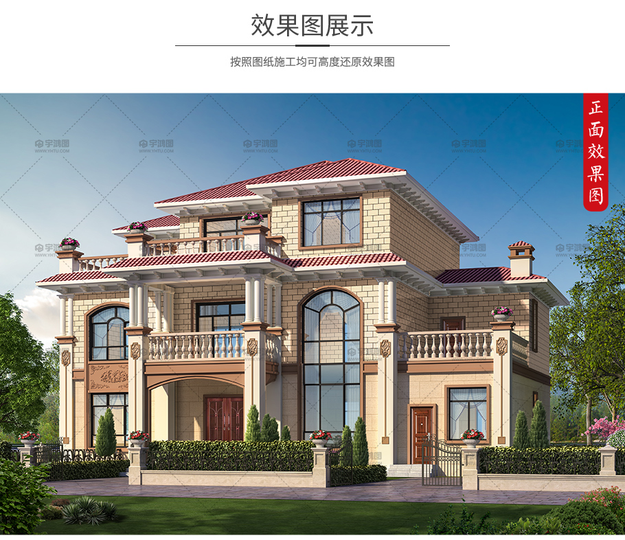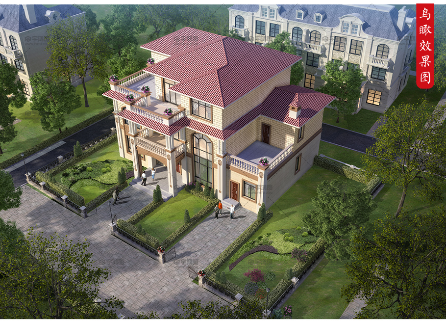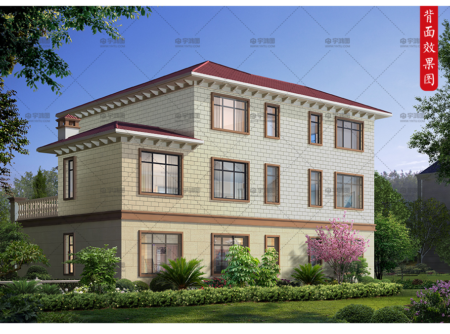 2019年鄉村新款帶灶房三層歐式別墅設計圖,框架結構。一層門廳進入33平方米大堂屋,堂屋東側有餐客廳大通間,餐廳東側雜物間,清洗池,灶房,廚房一體化。樓梯間有儲藏空間,堂屋西側有2個臥室。二層有4個臥室,一個起居室,一個儲藏間,洗衣房,露臺,陽臺。三層有3個臥室,其中兩個帶衣帽間,南側和西側各有一個露臺。
