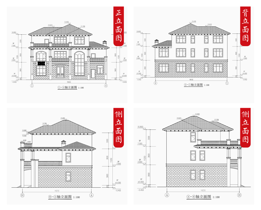 建筑立面圖:東立面圖,西立面圖,南立面圖,北立面圖,剖面圖;