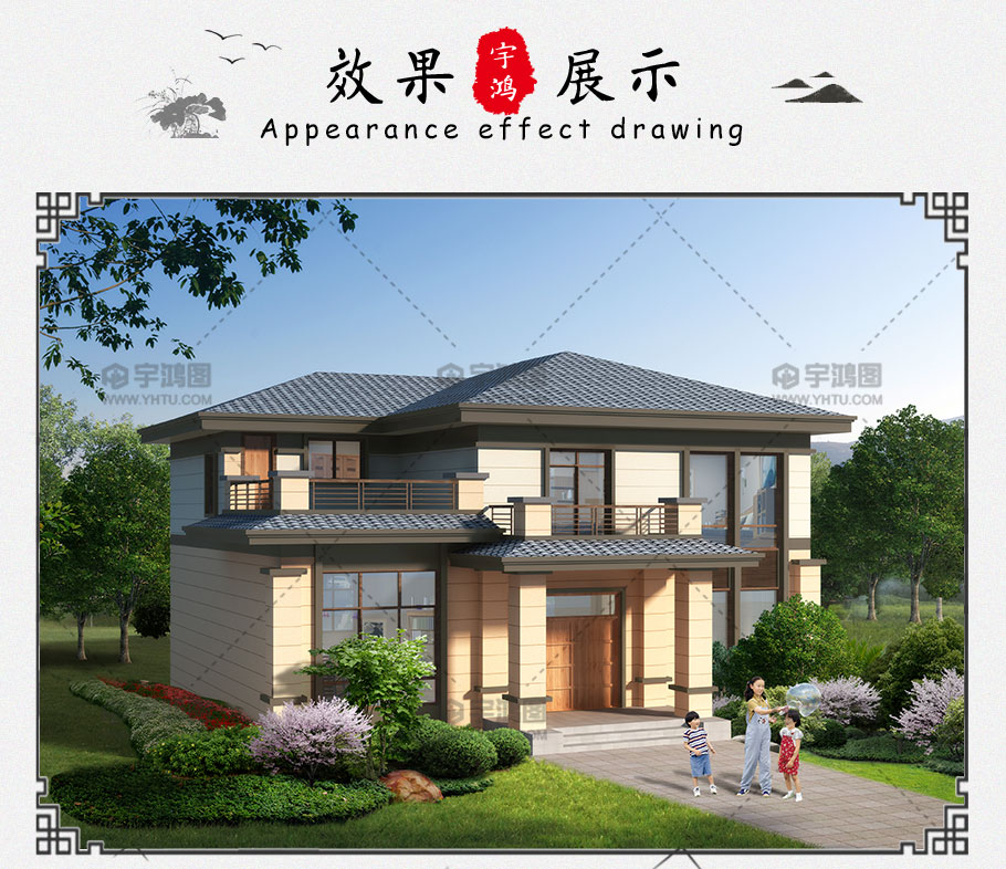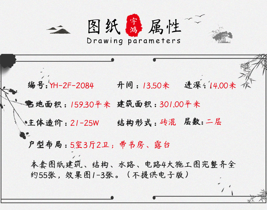 風(fēng)格:中式 | 層數(shù):二層 | 結(jié)構(gòu)形式:磚混結(jié)構(gòu) | 圖紙編號(hào):YH-A-2084 |