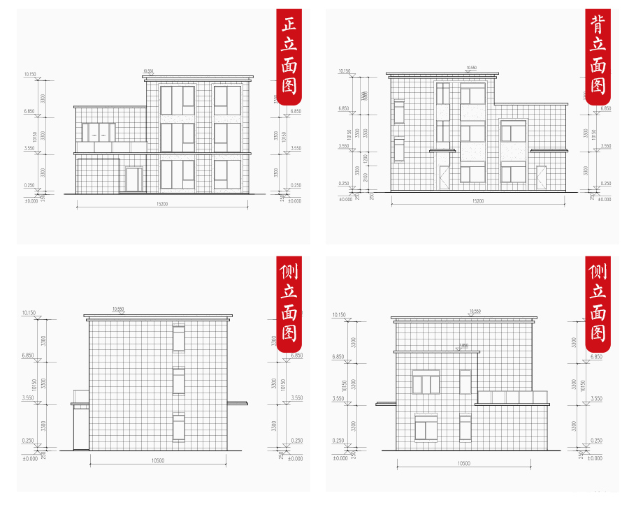 建筑圖: 建筑平面圖:一層平面圖,二層平面圖,三層平面圖; 建筑立面圖:東立面圖,西立面圖,南立面圖,北立面圖,剖面圖; 大樣圖:樓梯詳圖,細部大樣,門窗大樣