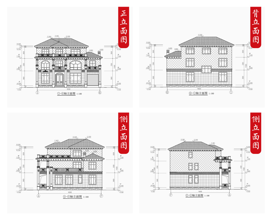 建筑立面圖:東立面圖,西立面圖,南立面圖,北立面圖,剖面圖;