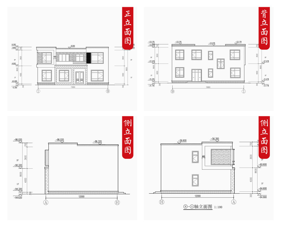 建筑圖: 建筑平面圖:一層平面圖,二層平面圖; 建筑立面圖:東立面圖,西立面圖,南立面圖,北立面圖,剖面圖; 大樣圖:樓梯詳圖,細部大樣,門窗大樣
