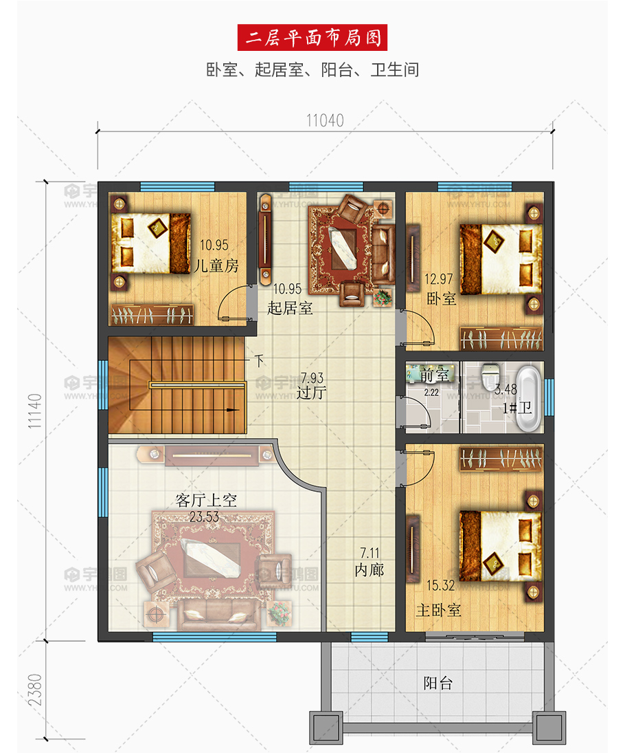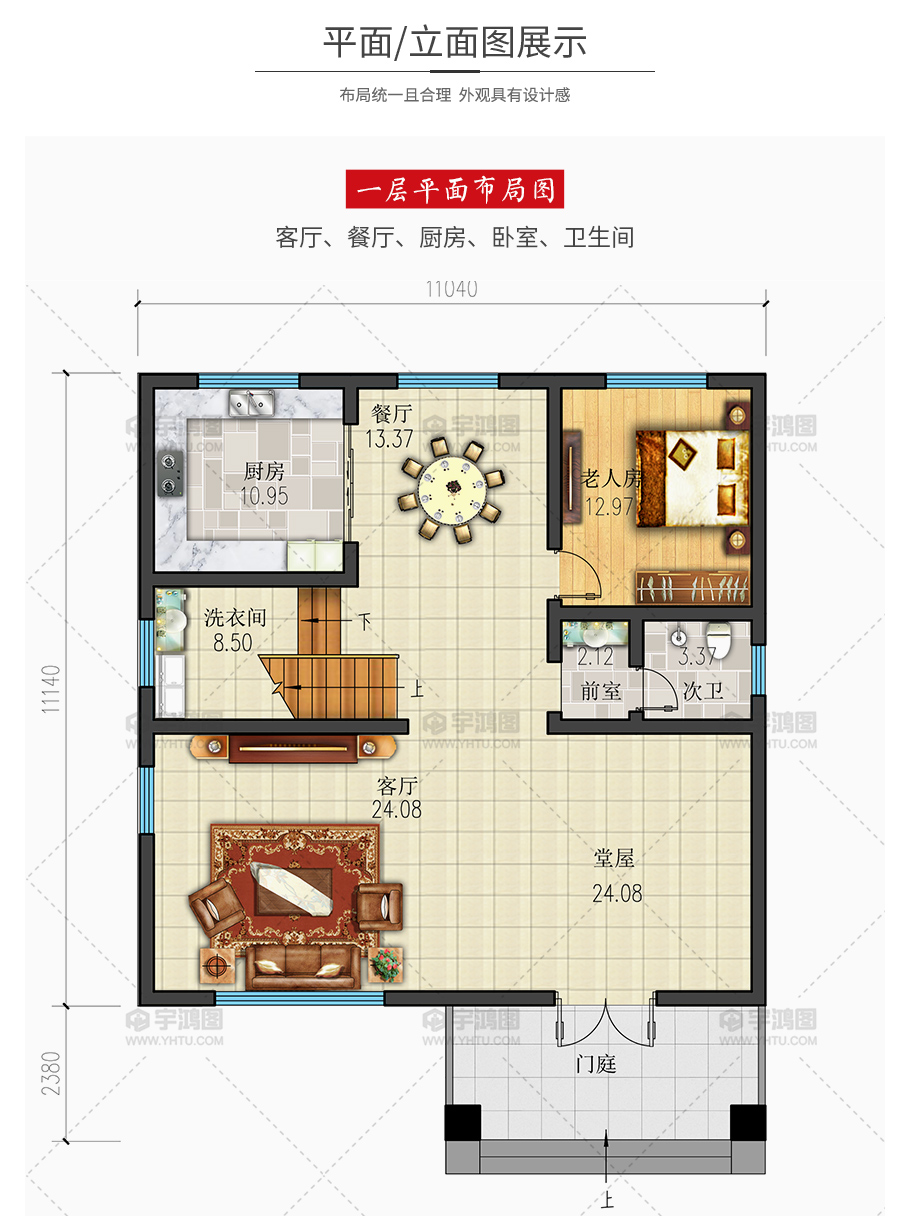 開(kāi)間:11.04米 | 進(jìn)深:13.52米 | 占地面積:122.9平方米 | 建筑面積:234.85平方米 |