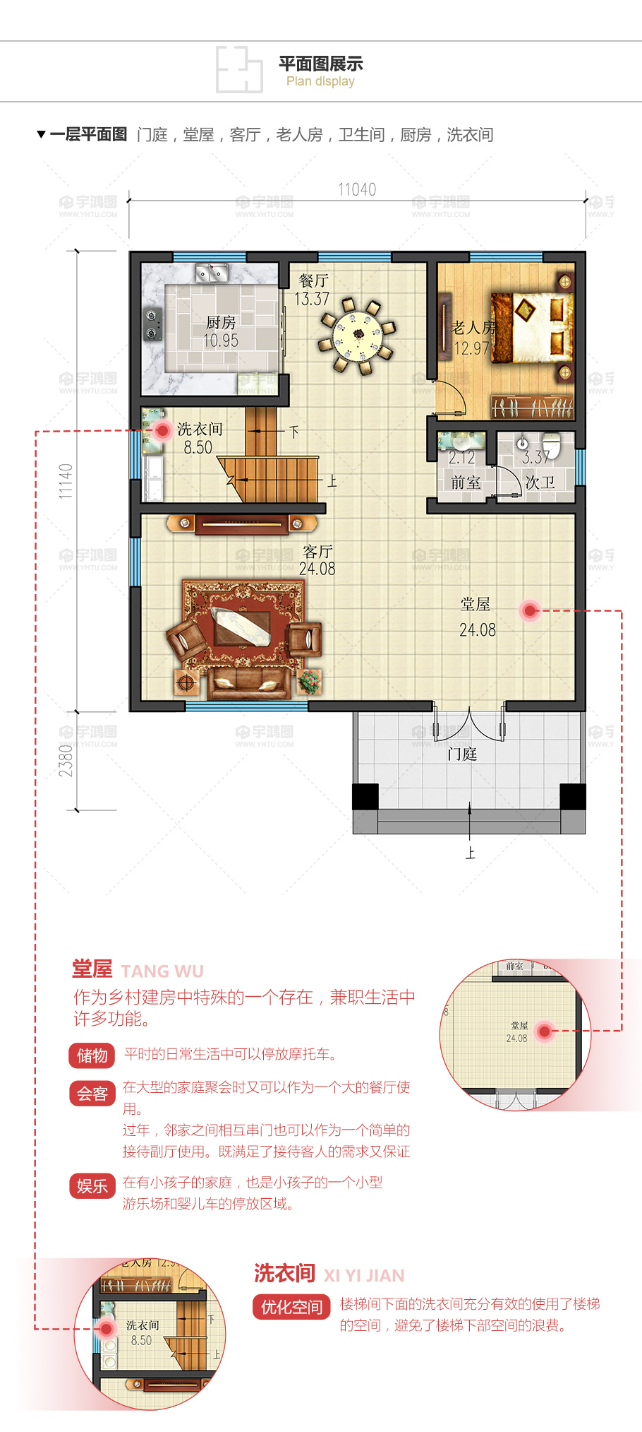 開間:11.04米 | 進深:13.52米 | 占地面積:122.9平方米 | 建筑面積:234.85平方米 |
