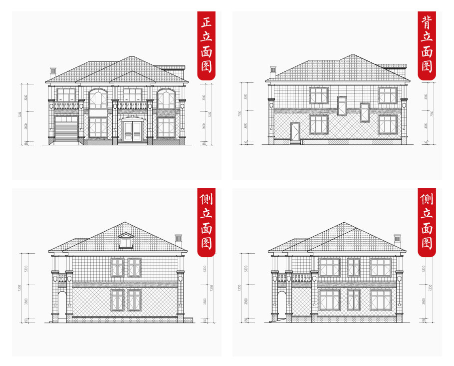 建筑立面圖:東立面圖,西立面圖,南立面圖,北立面圖,剖面圖;