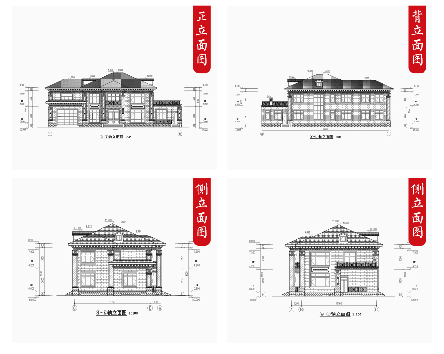建筑立面圖:東立面圖,西立面圖,南立面圖,北立面圖,剖面圖;