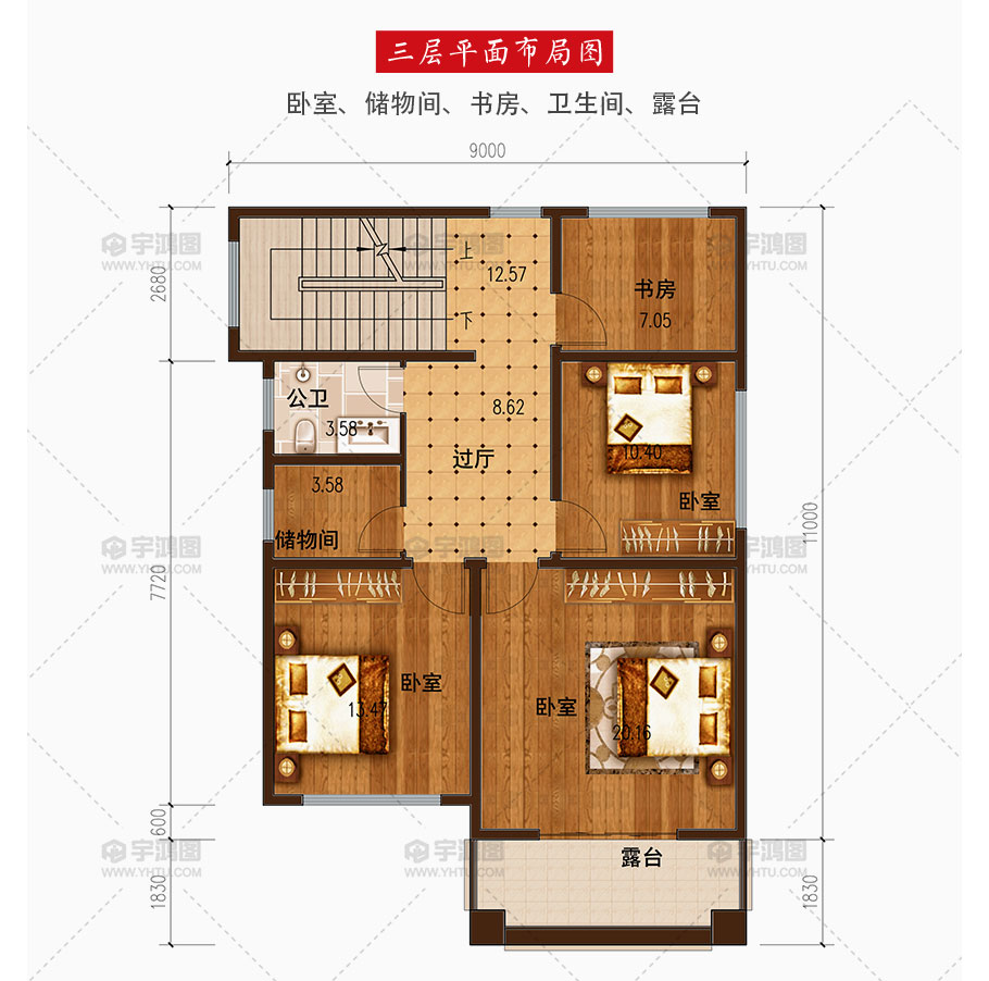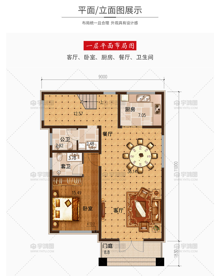 開(kāi)間:9米 | 進(jìn)深:12.83米 | 占地面積:91.8平方米 | 建筑面積:359平方米 |