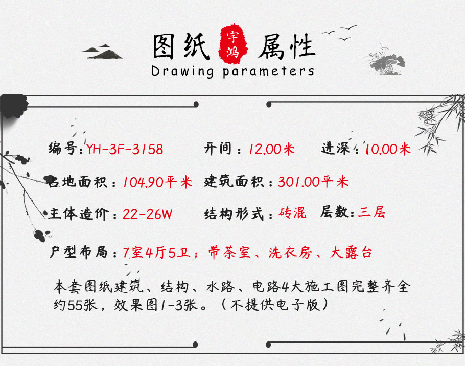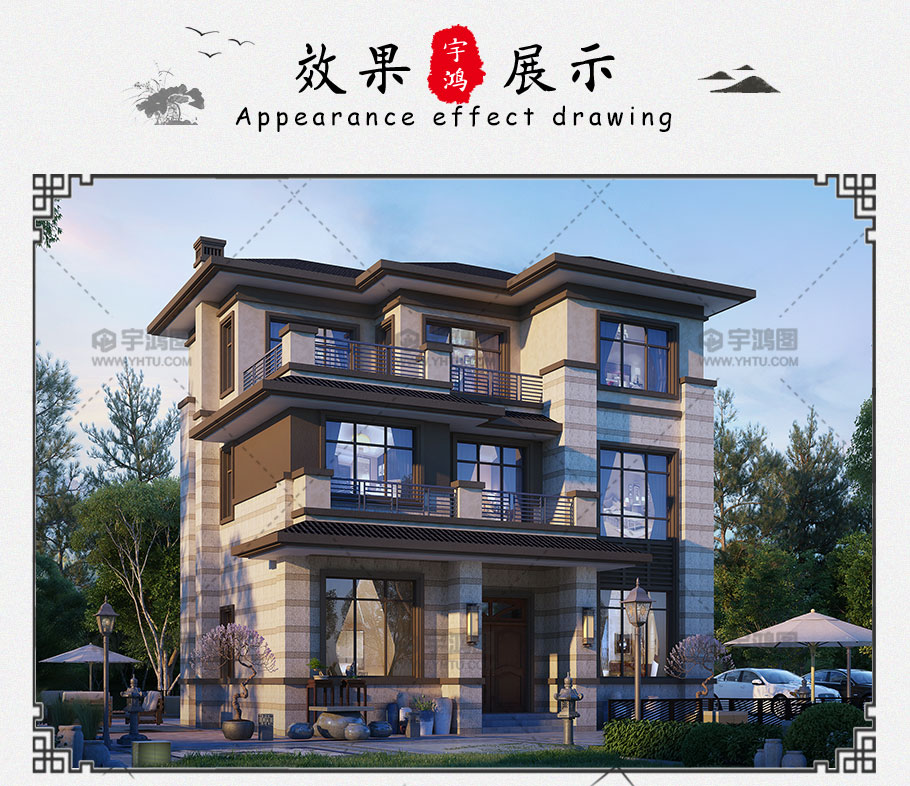 風(fēng)格:新中式 | 層數(shù):三層 | 結(jié)構(gòu)形式:磚混結(jié)構(gòu) | 圖紙編號:YH-A-3158 |