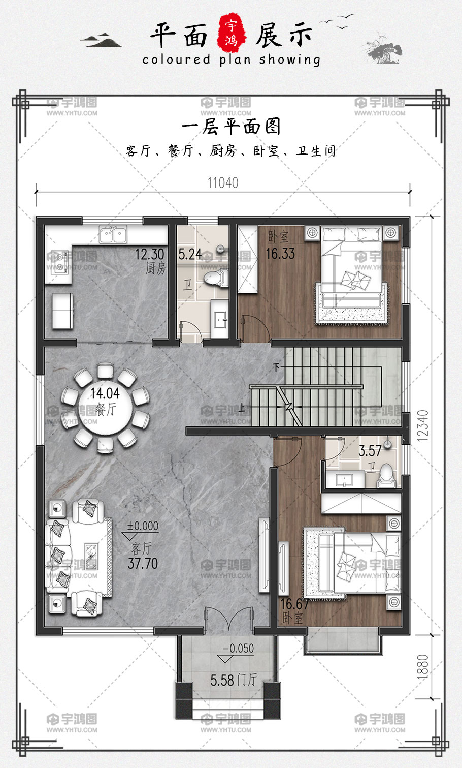 開間:11.04米 | 進深:12.34米 | 占地面積:136.2平方米 | 建筑面積:257.3平方米 |