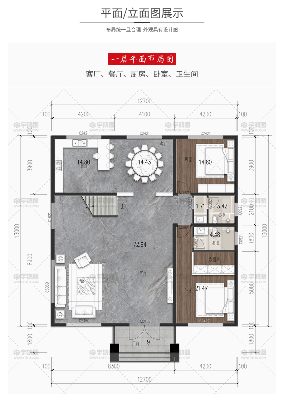 開(kāi)間:12.7米 | 進(jìn)深:13米 | 占地面積:165.1平方米 | 建筑面積:299.9平方米 |