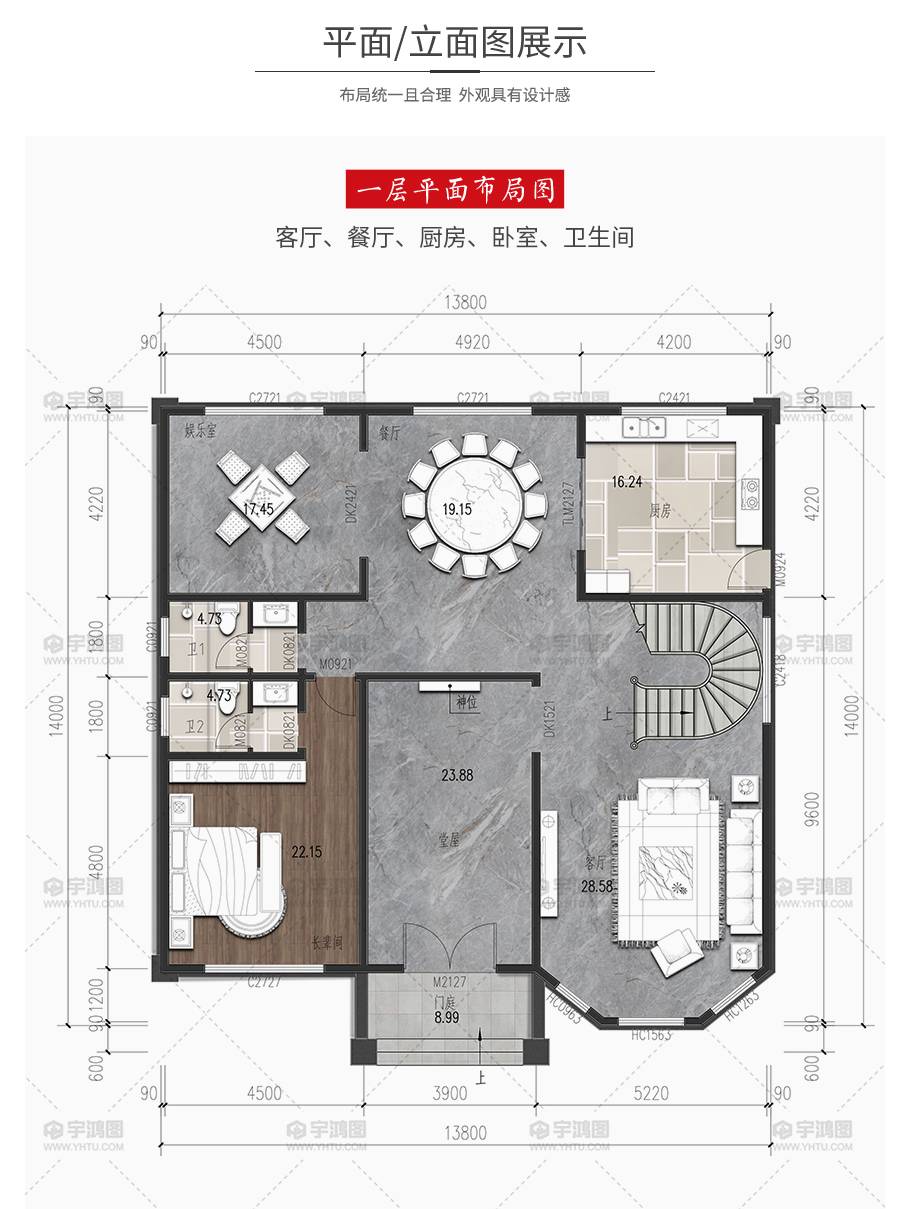 開(kāi)間:13.8米 | 進(jìn)深:14米 | 占地面積:190.59平方米 | 建筑面積:475平方米 |