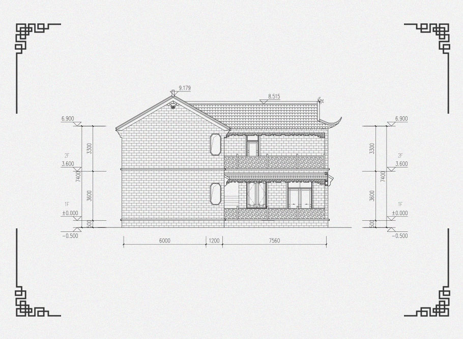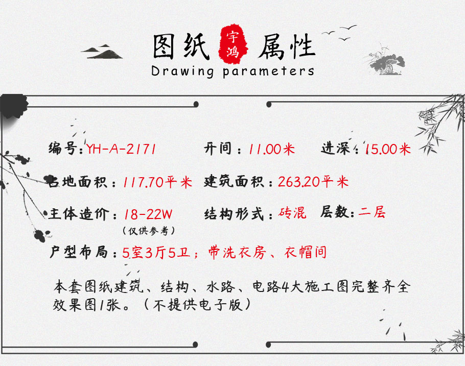 風格:中式 | 層數:二層 | 結構形式:磚混結構 | 圖紙編號:YH-A-2171 |