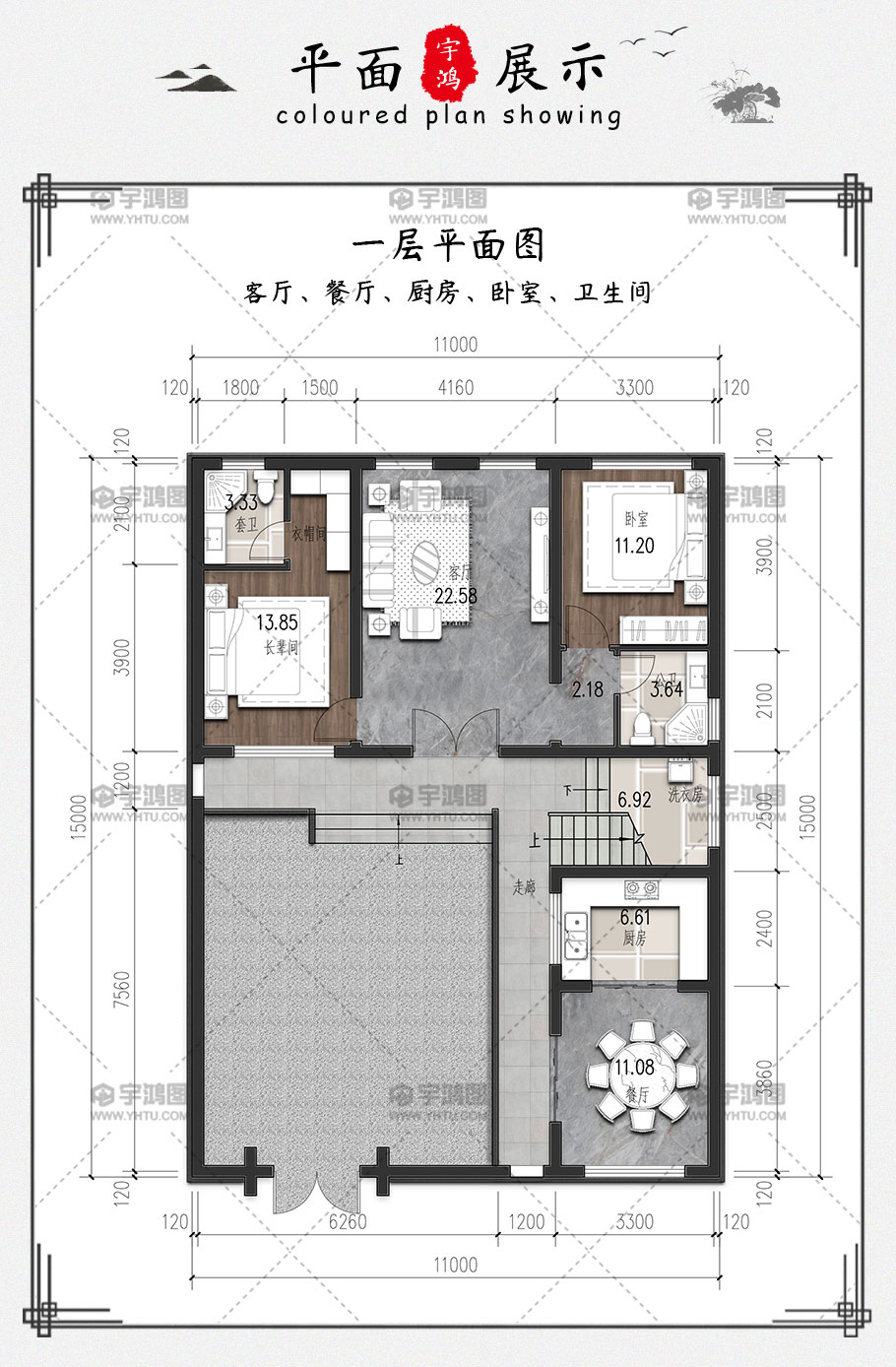 開間:11米 | 進深:15米 | 占地面積:117.7平方米 | 建筑面積:263.2平方米 |