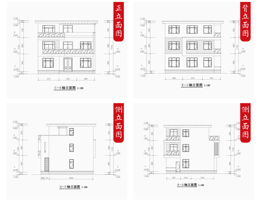 建筑立面圖:東立面圖,西立面圖,南立面圖,北立面圖,剖面圖;