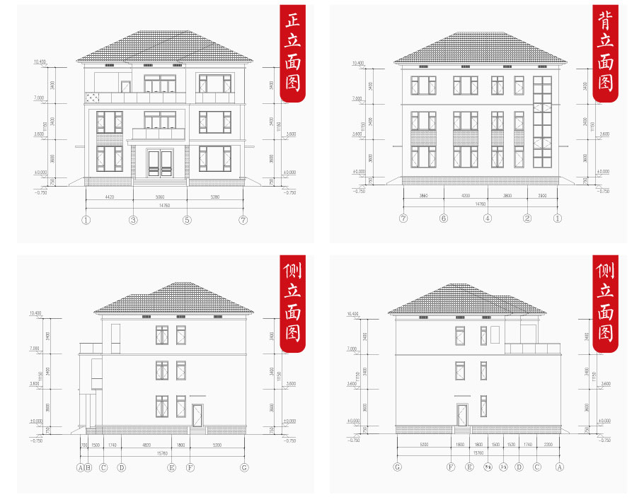 建筑圖: 建筑平面圖:一層平面圖,二層平面圖,三層平面圖; 建筑立面圖:東立面圖,西立面圖,南立面圖,北立面圖,剖面圖; 大樣圖:樓梯詳圖,細部大樣,門窗大樣