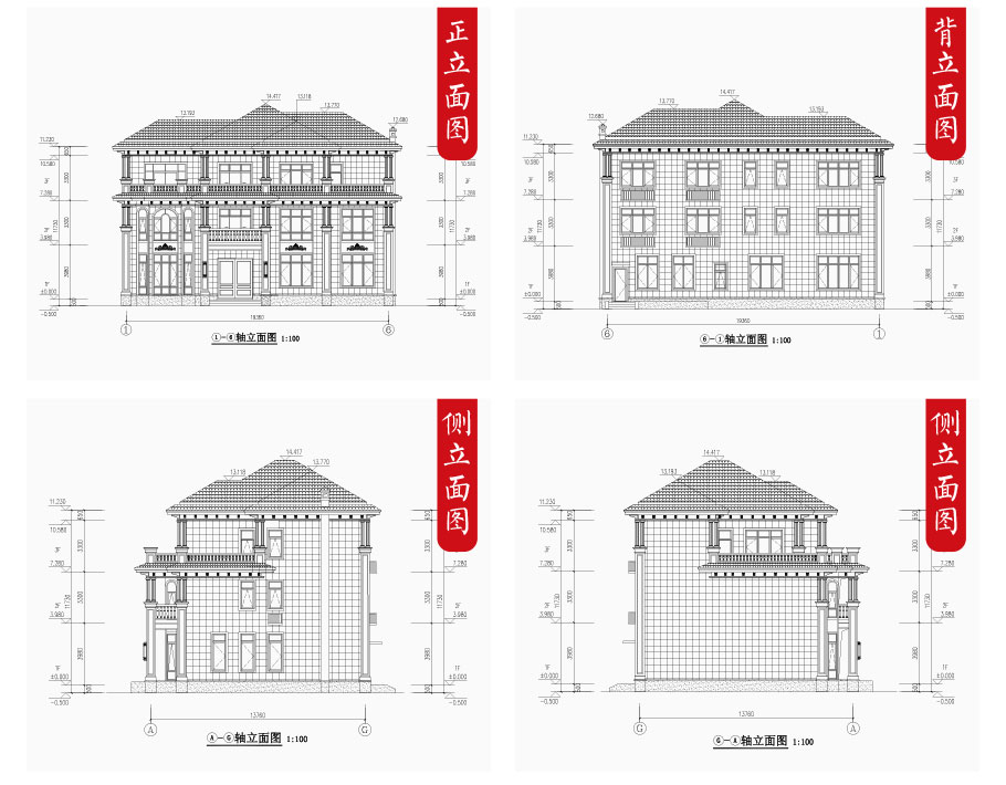 建筑立面圖:東立面圖,西立面圖,南立面圖,北立面圖,剖面圖;