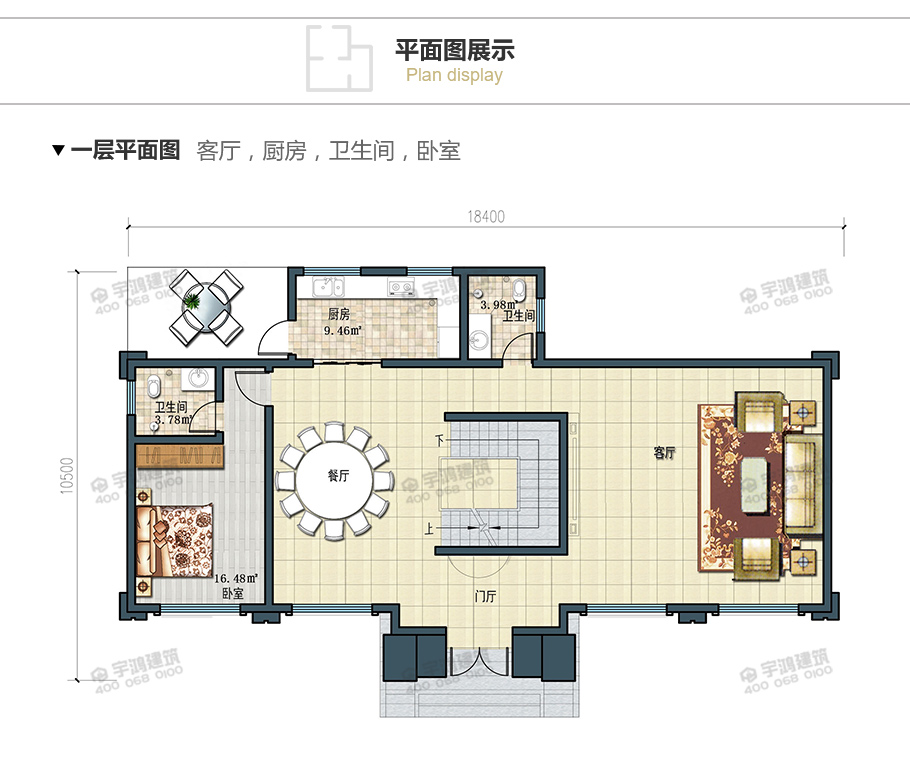 開間:18.4米 | 進深:10.5米 | 占地面積:144.4平方米 | 建筑面積:378.4平方米 |