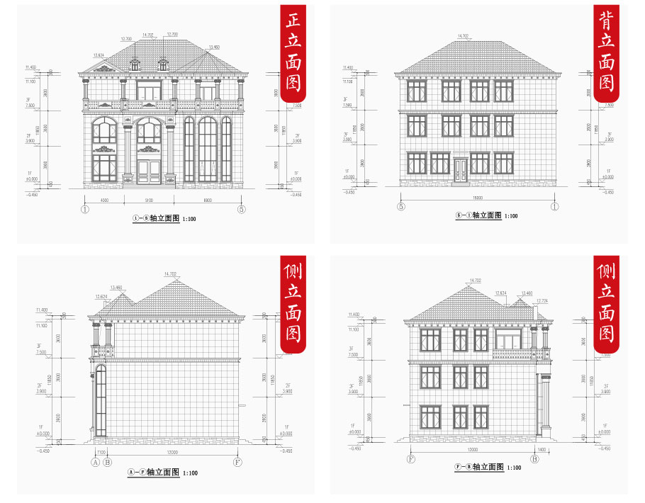 建筑圖: | 建筑平面圖:一層平面圖,二層平面圖,三層平面圖; 建筑立面圖:東立面圖,西立面圖,南立面圖,北立面圖,剖面圖; 大樣圖:樓梯詳圖,細部大樣,門窗大樣 |