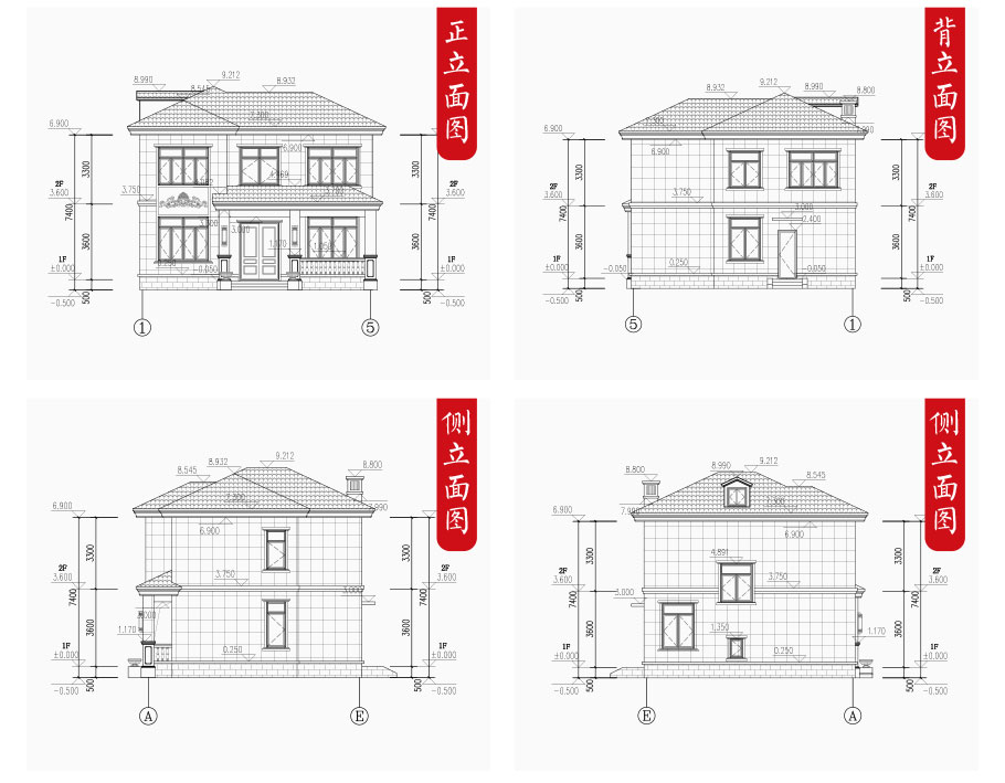建筑立面圖:東立面圖,西立面圖,南立面圖,北立面圖,剖面圖;