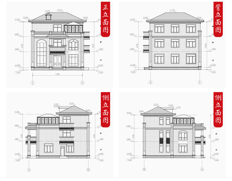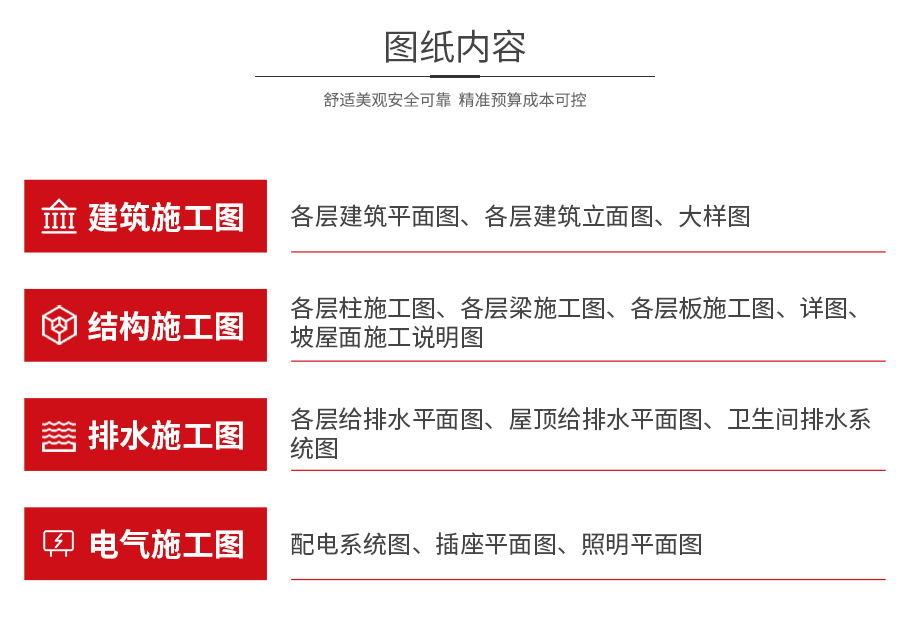 建筑圖: | 建筑平面圖:一層平面圖,二層平面圖,三層平面圖; 建筑立面圖:東立面圖,西立面圖,南立面圖,北立面圖,剖面圖; 大樣圖:樓梯詳圖,細部大樣,門窗大樣 |