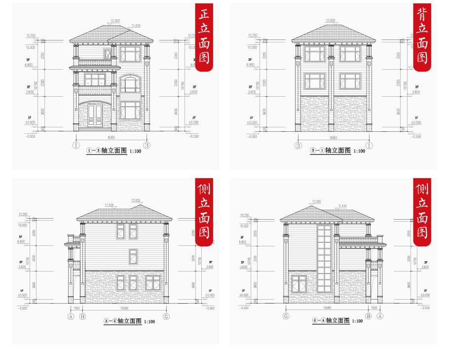 建筑圖: | 建筑平面圖:一層平面圖,二層平面圖,三層平面圖; 建筑立面圖:東立面圖,西立面圖,南立面圖,北立面圖,剖面圖; 大樣圖:樓梯詳圖,細部大樣,門窗大樣 |