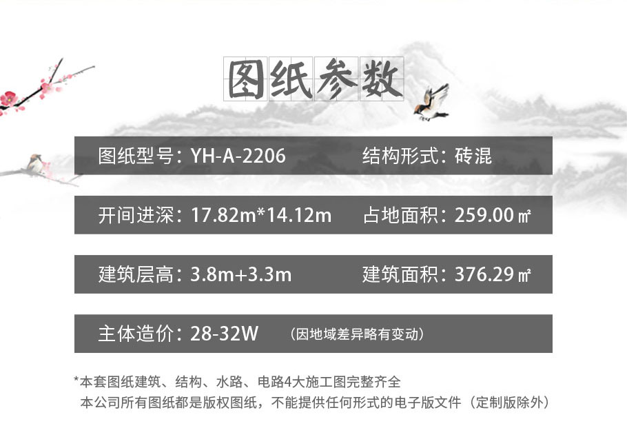 風格:中式 | 層數:二層 | 結構形式:磚混結構 | 圖紙編號:YH-A-2206 |