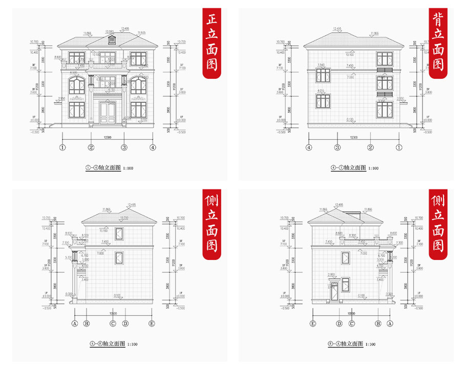 建筑立面圖:東立面圖,西立面圖,南立面圖,北立面圖,剖面圖;