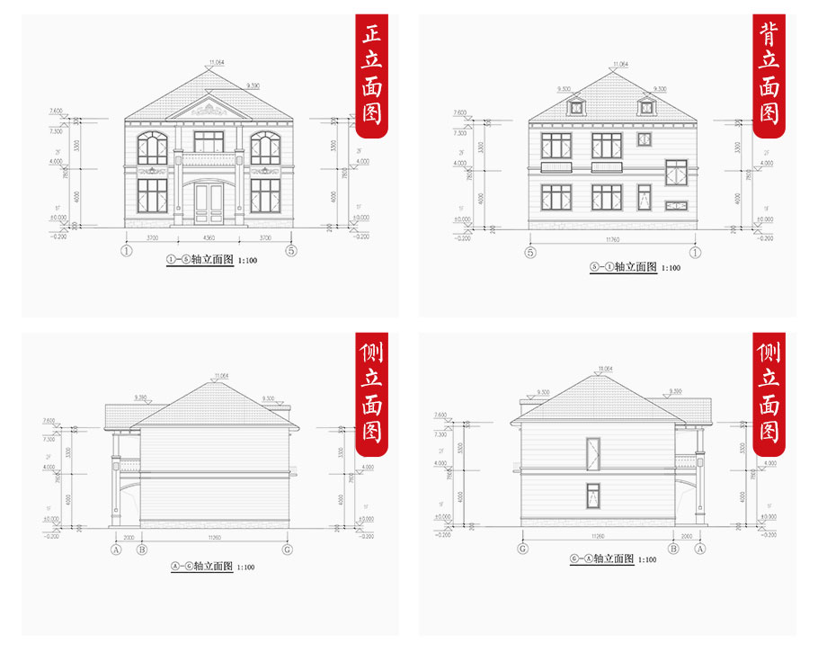 建筑圖: | 建筑平面圖:一層平面圖,二層平面圖; 建筑立面圖:東立面圖,西立面圖,南立面圖,北立面圖,剖面圖; 大樣圖:樓梯詳圖,細(xì)部大樣,門窗大樣 |