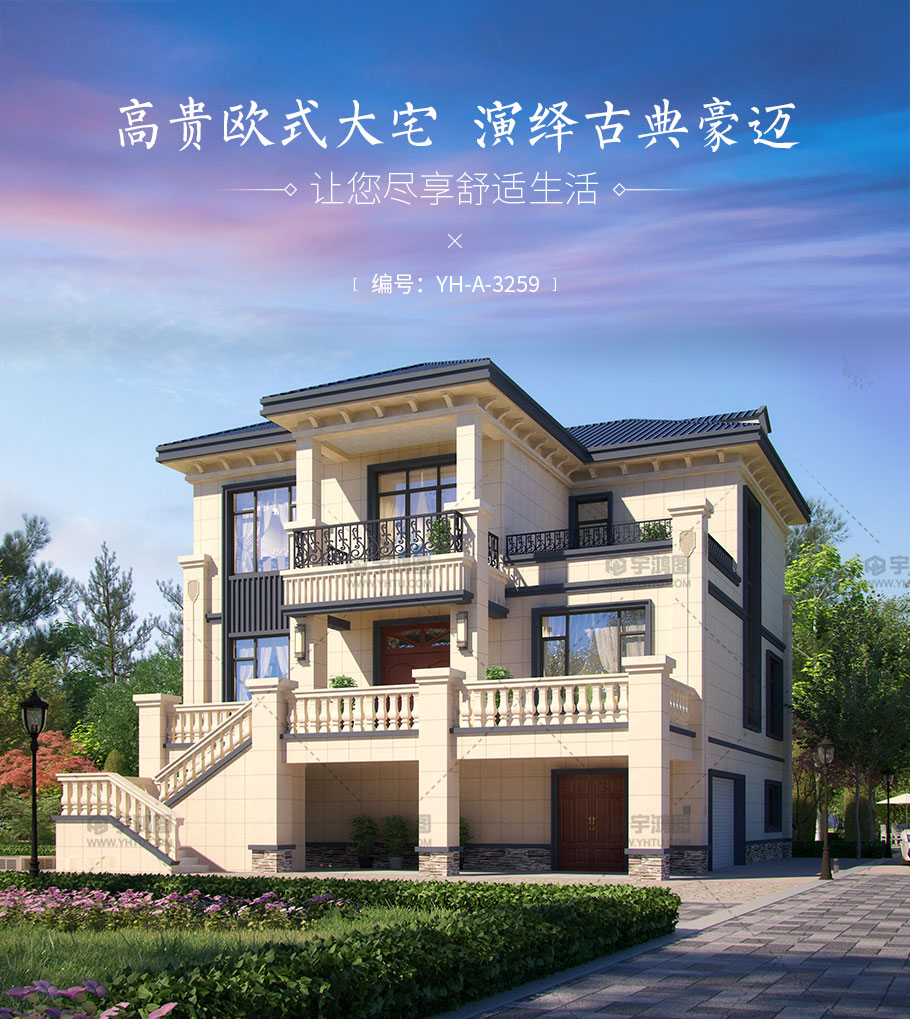 風(fēng)格:歐式 | 層數(shù):三層 | 結(jié)構(gòu)形式:框架結(jié)構(gòu) | 圖紙編號(hào):YH-A-3259 |