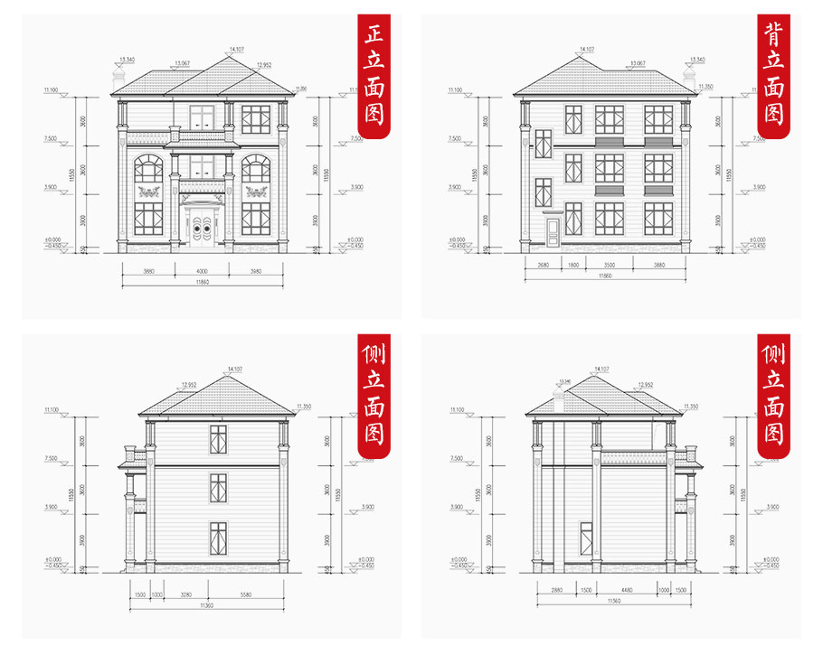 建筑平面圖:一層平面圖,二層平面圖,三層平面圖; 建筑立面圖:東立面圖,西立面圖,南立面圖,北立面圖,剖面圖; 大樣圖:樓梯詳圖,細部大樣,門窗大樣 |