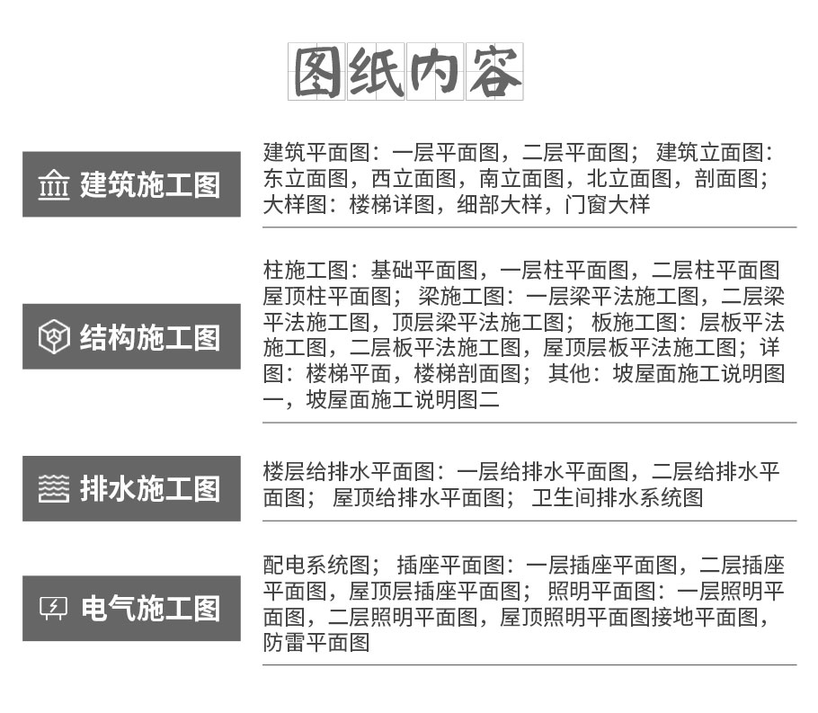 建筑圖: | 建筑平面圖:一層平面圖,二層平面圖; 建筑立面圖:東立面圖,西立面圖,南立面圖,北立面圖,剖面圖; 大樣圖:樓梯詳圖,細(xì)部大樣,門窗大樣 |
