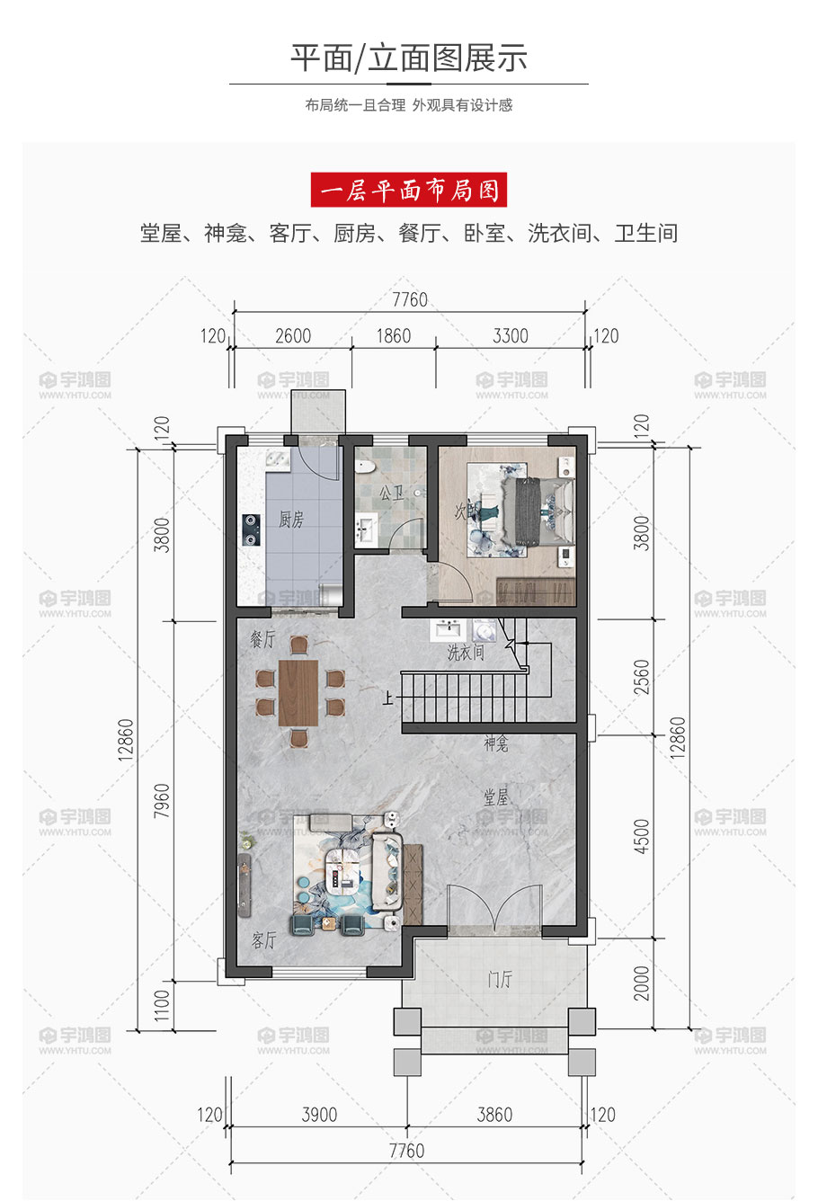開(kāi)間:7.7米 | 進(jìn)深:12.8米 | 占地面積:96.5平方米 | 建筑面積:268平方米 |