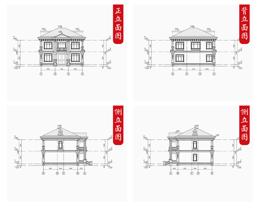 建筑圖: | 建筑平面圖:一層平面圖,二層平面圖; 建筑立面圖:東立面圖,西立面圖,南立面圖,北立面圖,剖面圖; 大樣圖:樓梯詳圖,細部大樣,門窗大樣 |