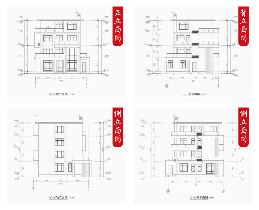 建筑平面圖:一層平面圖,二層平面圖,三層平面圖,四層平面圖; 建筑立面圖:東立面圖,西立面圖,南立面圖,北立面圖,剖面圖; 大樣圖:樓梯詳圖,細部大樣,門窗大樣 |