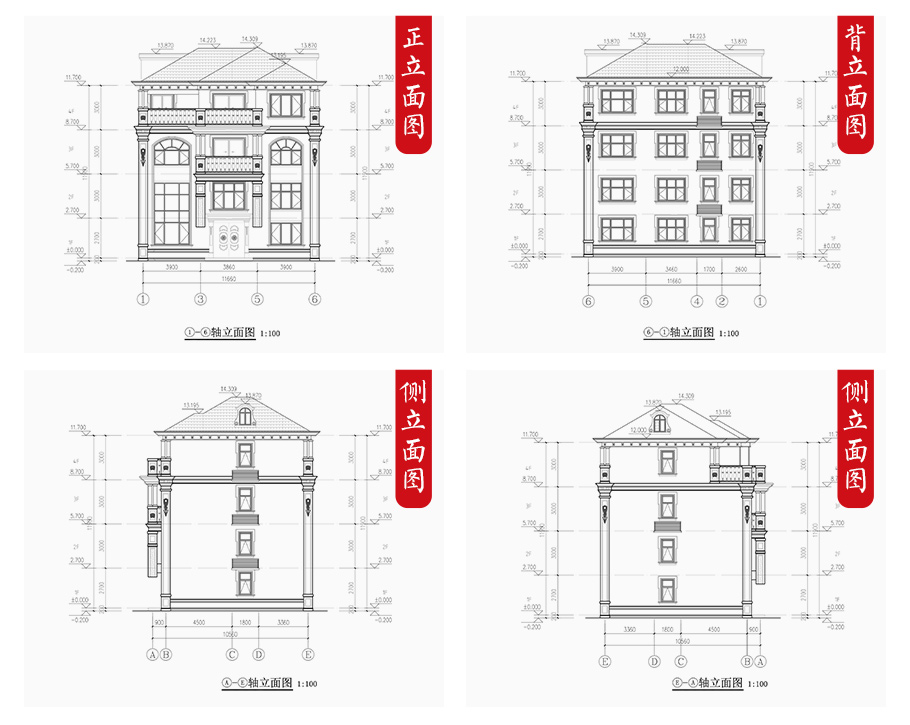 建筑平面圖:一層平面圖,二層平面圖,三層平面圖,四層平面圖; 建筑立面圖:東立面圖,西立面圖,南立面圖,北立面圖,剖面圖; 大樣圖:樓梯詳圖,細部大樣,門窗大樣 |