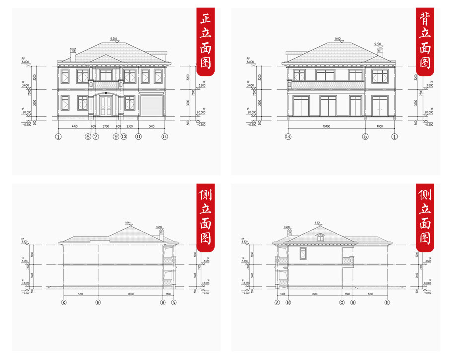 建筑圖: | 建筑平面圖:一層平面圖,二層平面圖; 建筑立面圖:東立面圖,西立面圖,南立面圖,北立面圖,剖面圖; 大樣圖:樓梯詳圖,細(xì)部大樣,門窗大樣 |