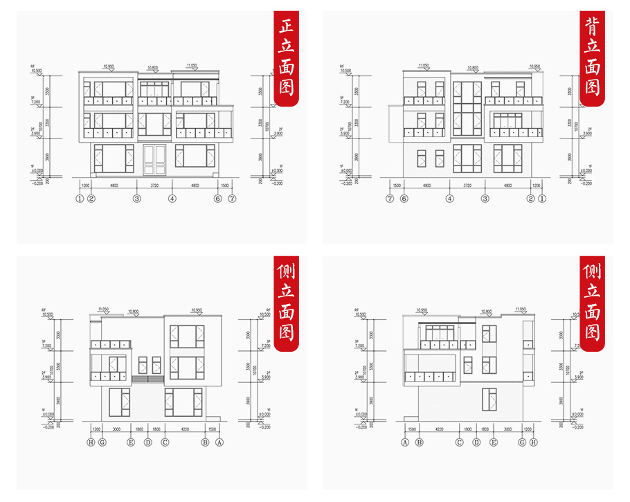 建筑圖: 建筑平面圖:一層平面圖,二層平面圖,三層平面圖; 建筑立面圖:東立面圖,西立面圖,南立面圖,北立面圖,剖面圖; 大樣圖:樓梯詳圖,細部大樣,門窗大樣
