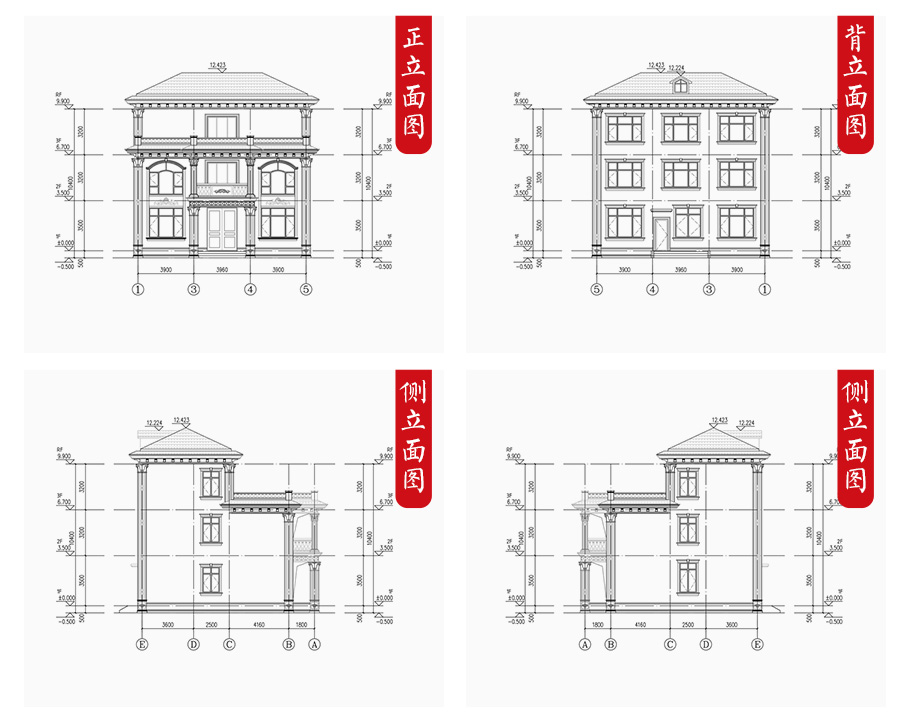 建筑平面圖:一層平面圖,二層平面圖,三層平面圖; 建筑立面圖:東立面圖,西立面圖,南立面圖,北立面圖,剖面圖; 大樣圖:樓梯詳圖,細部大樣,門窗大樣 |