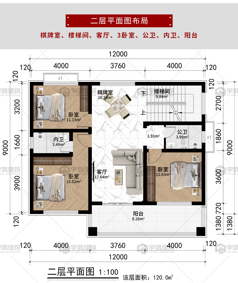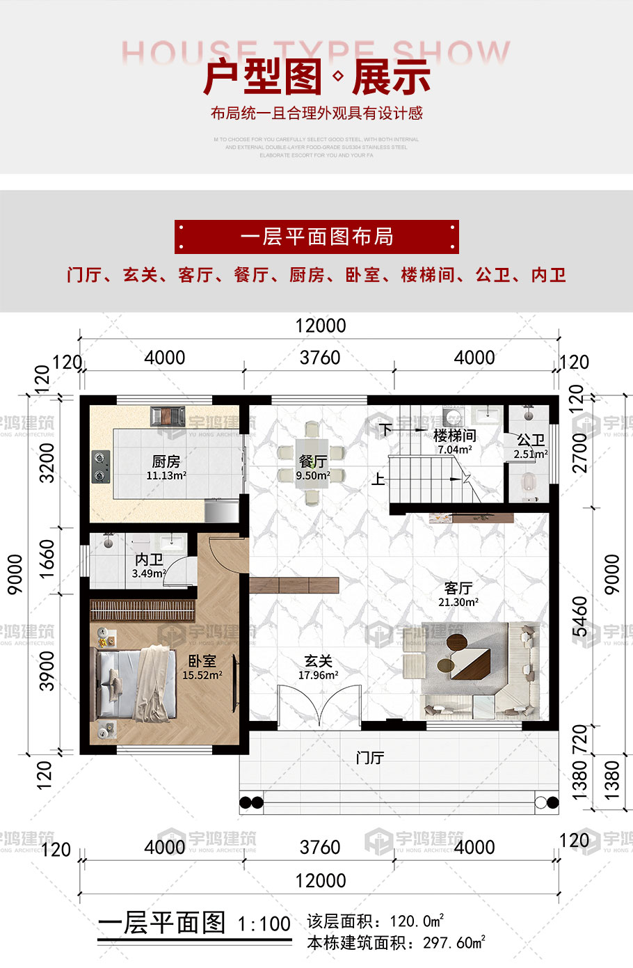 開(kāi)間:12米 | 進(jìn)深:10.38米 | 占地面積:120平方米 | 建筑面積:297.6平方米 |