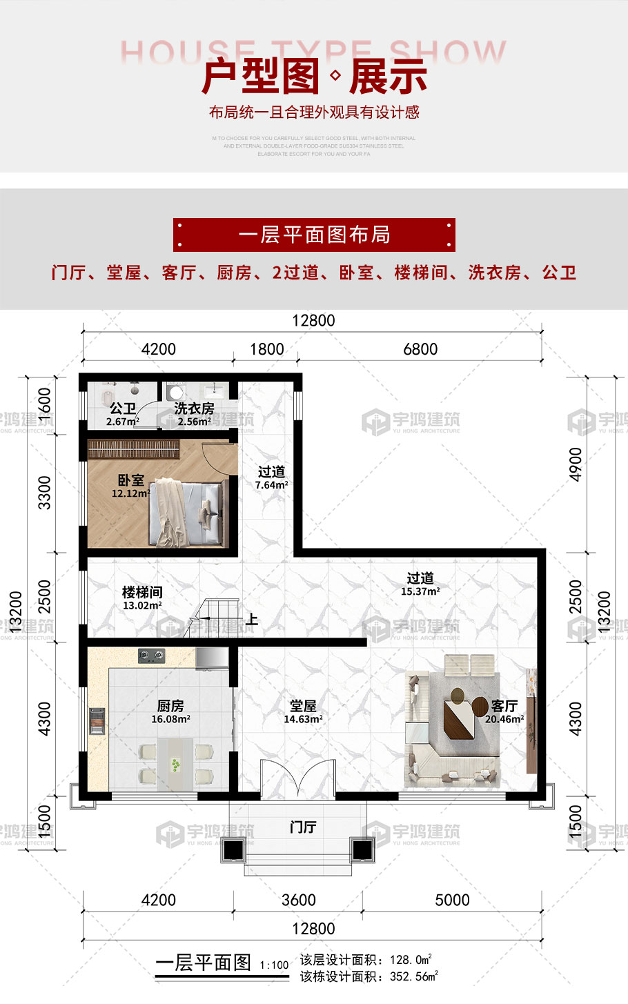 開間:12.8米 進深:13.2米 占地面積:128平方米 建筑面積:352.56平方米