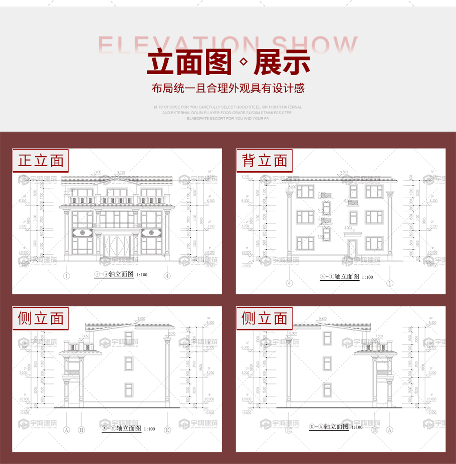 建筑平面圖:一層平面圖,二層平面圖,三層平面圖; 建筑立面圖:東立面圖,西立面圖,南立面圖,北立面圖,剖面圖; 大樣圖:樓梯詳圖,細(xì)部大樣,門窗大樣 |