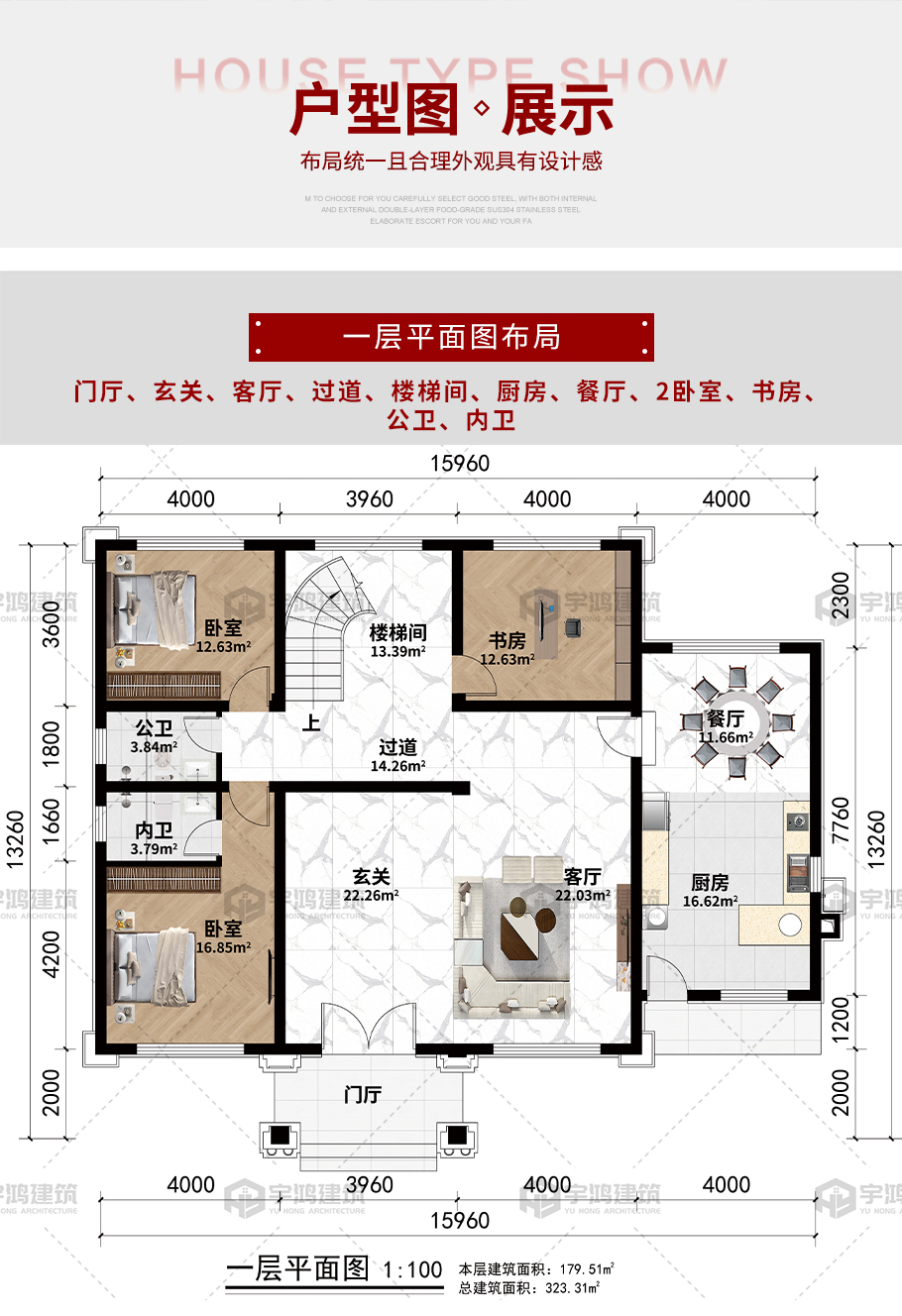 開(kāi)間:15.96米 | 進(jìn)深:13.26米 | 占地面積:187.31平方米 | 建筑面積:323.31平方米 |