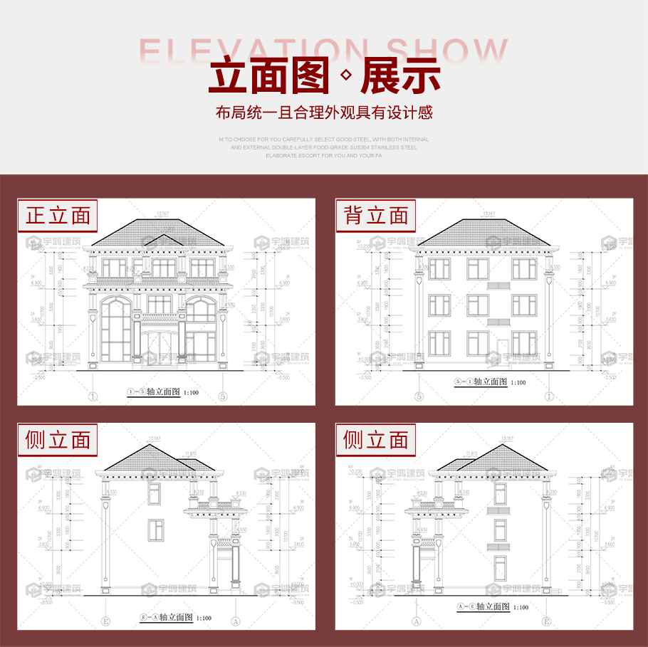 建筑平面圖:一層平面圖,二層平面圖,三層平面圖; 建筑立面圖:東立面圖,西立面圖,南立面圖,北立面圖,剖面圖; 大樣圖:樓梯詳圖,細(xì)部大樣,門窗大樣 |