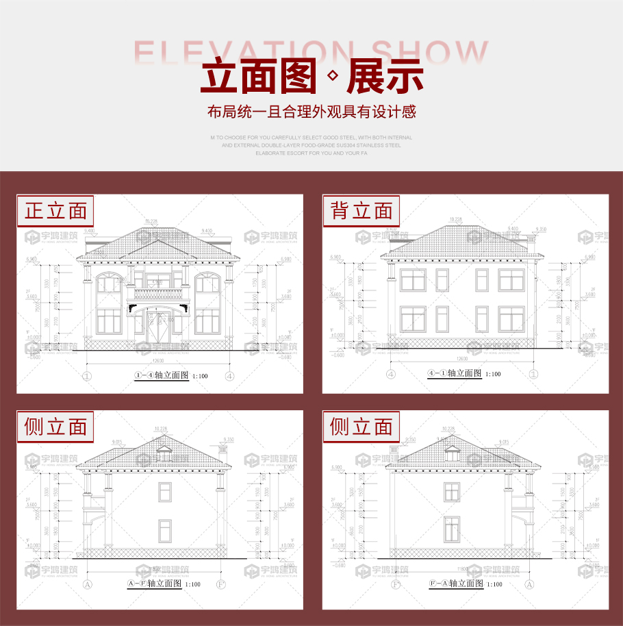 建筑圖: | 建筑平面圖:一層平面圖,二層平面圖; 建筑立面圖:東立面圖,西立面圖,南立面圖,北立面圖,剖面圖; 大樣圖:樓梯詳圖,細部大樣,門窗大樣 |