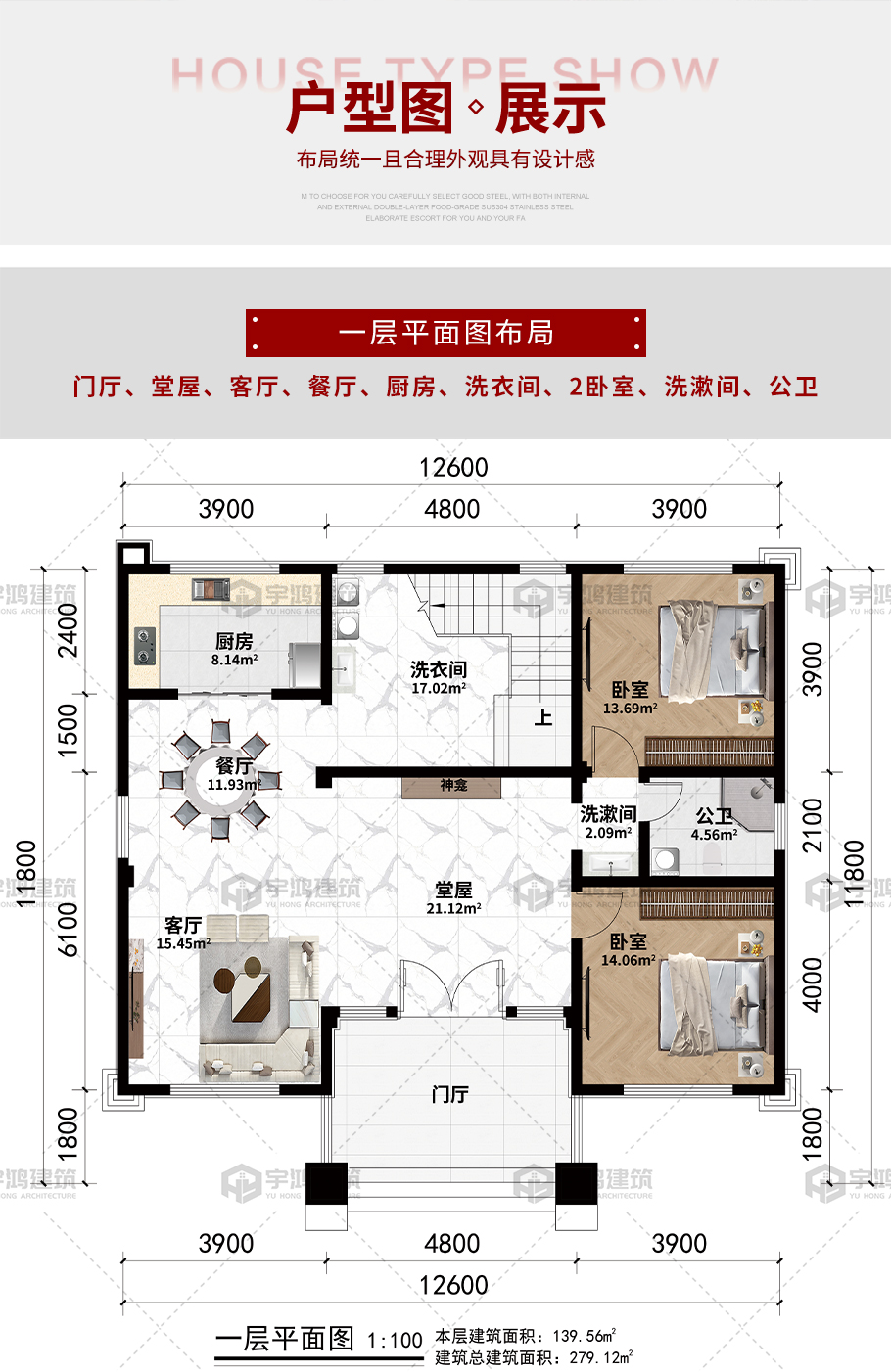 開間:12.6米 | 進深:11.8米 | 占地面積:139.56平方米 | 建筑面積:279.12平方米 |