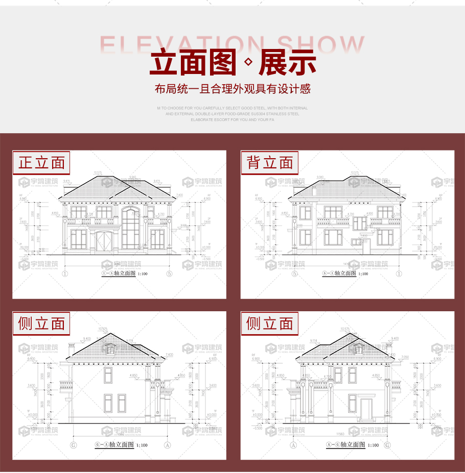 建筑圖: | 建筑平面圖:一層平面圖,二層平面圖; 建筑立面圖:東立面圖,西立面圖,南立面圖,北立面圖,剖面圖; 大樣圖:樓梯詳圖,細部大樣,門窗大樣 |