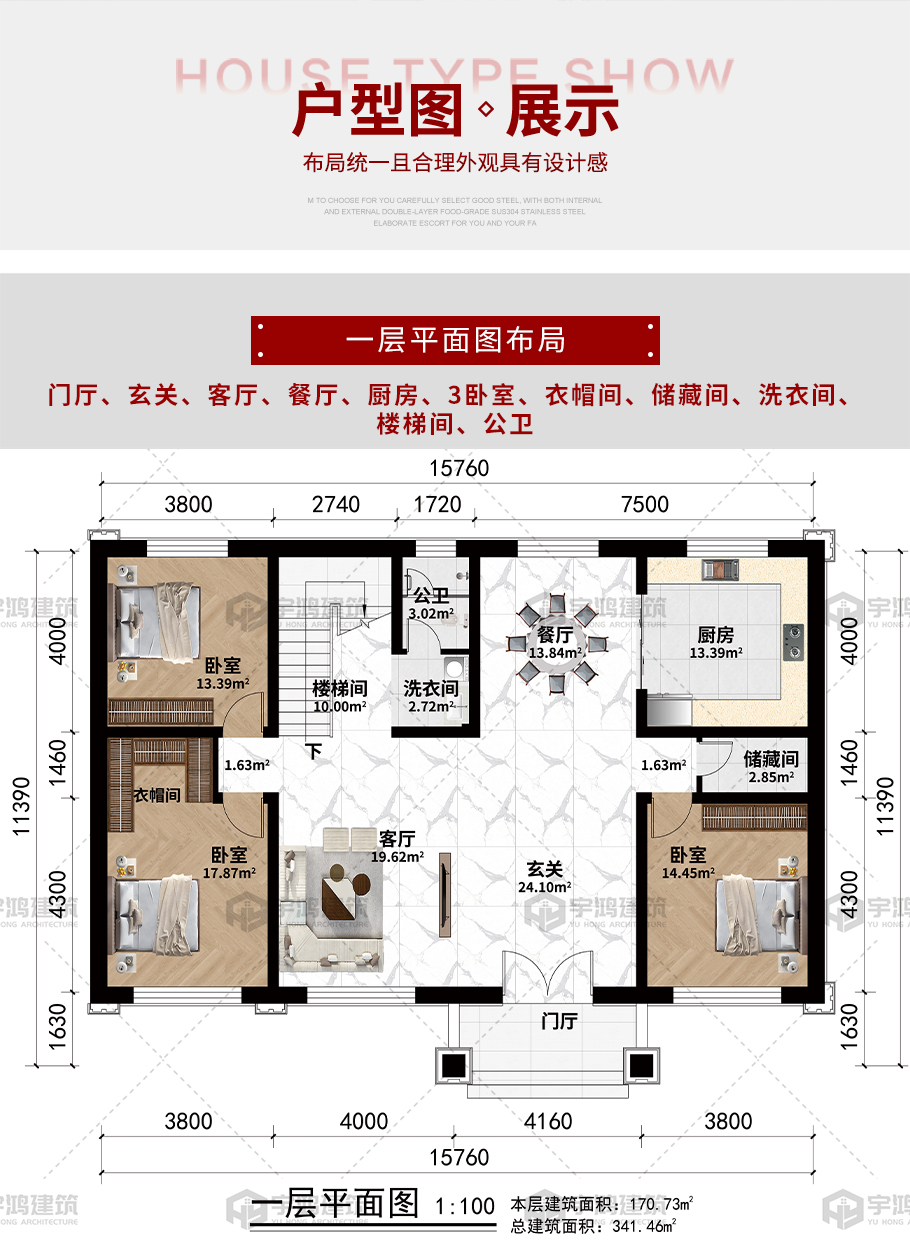 開間:15.76米 | 進深:11.39米 | 占地面積:175.14平方米 | 建筑面積:341.46平方米 |